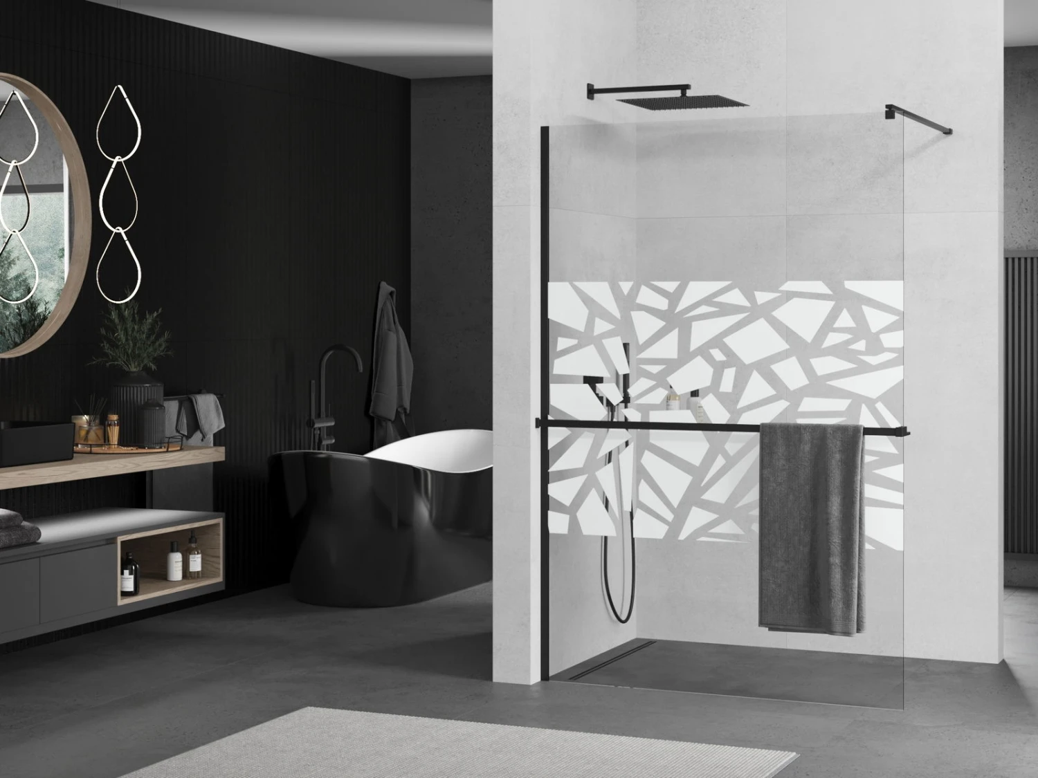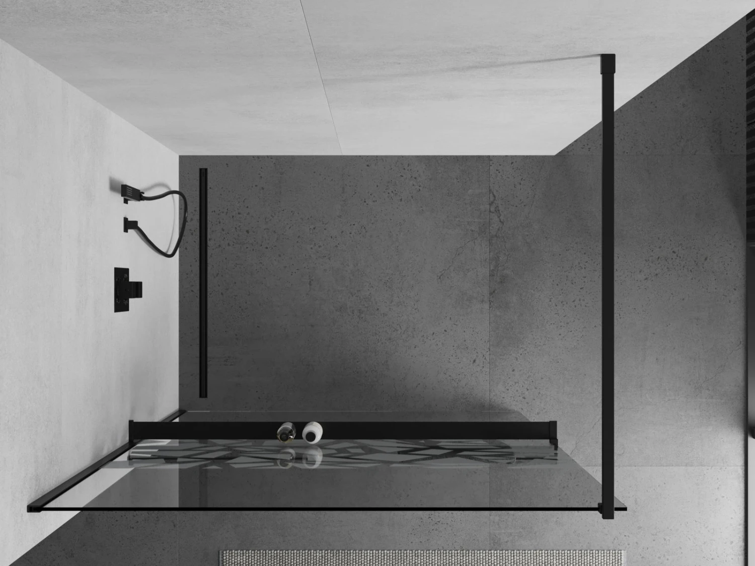 Mexen Kioto+ ścianka prysznicowa z półką i relingiem 110 x 200 cm, transparent/biały wzór 8 mm, czarna – 800-110-121-70-85
