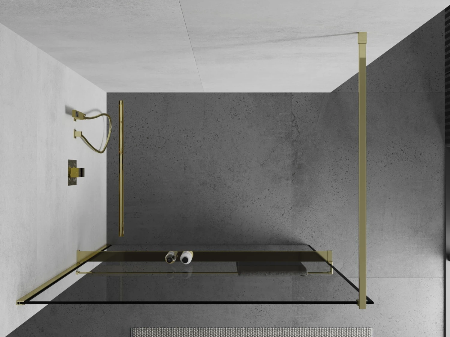 Mexen Kioto+ ścianka prysznicowa z półką i relingiem 70 x 200 cm, transparent/czarny wzór 8 mm, złota – 800-070-121-50-70